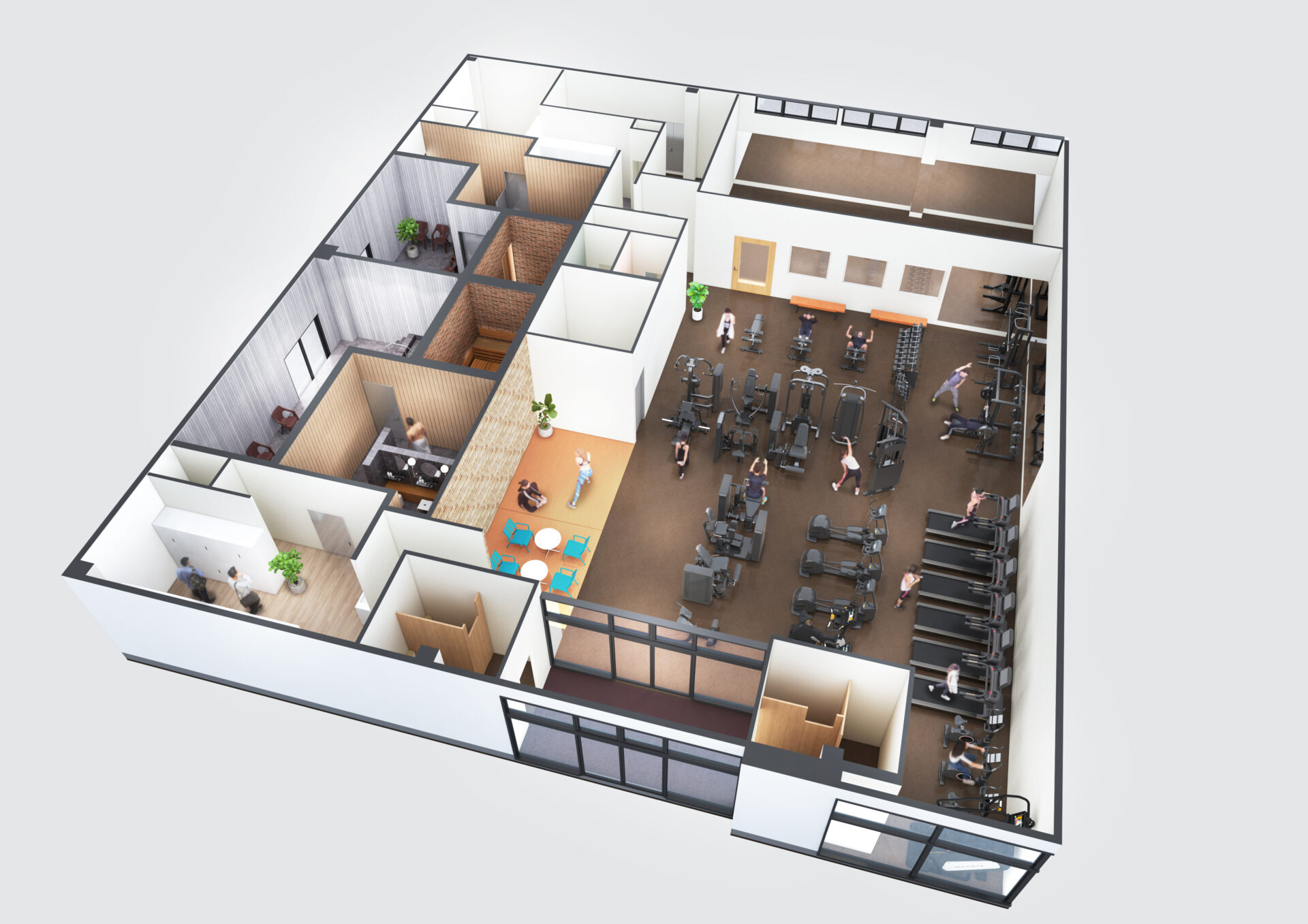 約150坪の施設に、トレーニングジム、ヴァーチャルスタジオ、シャワー、サウナ施設を