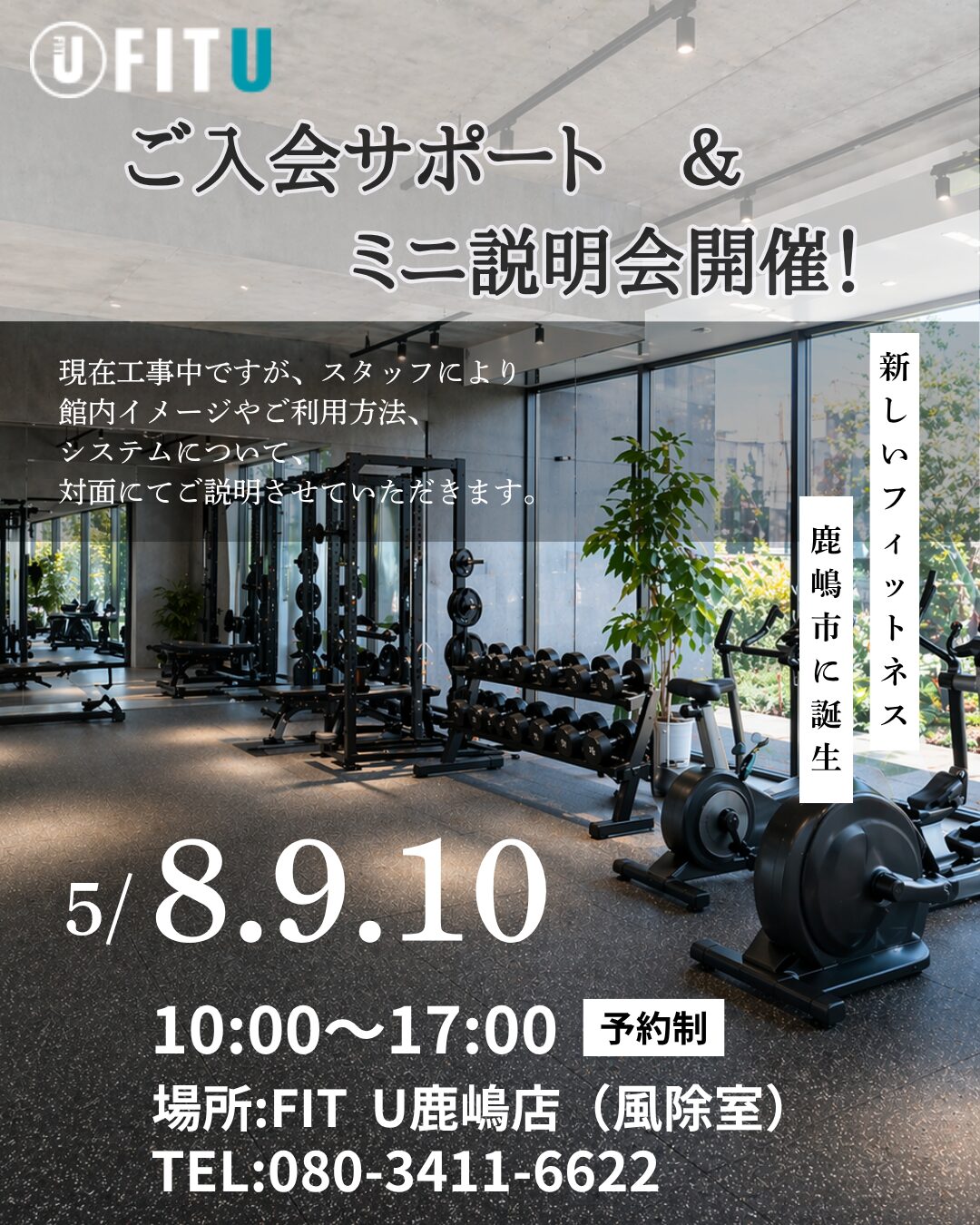 スタッフが一緒に入会手続きのお手伝いをさせていただきます!➡ミニ説明会 スタッフが上記時間で滞在しておりますので、直接ご案内いたします! オープン前に気になる点を解消できるチャンスです! 少しでも気になっている方は是非この機会にお越しください。 ※鹿嶋店は絶賛工事中ですので内覧はできかねます。予めご了承ください。 ※完全予約制となっております ※ご予約はお電話にて受付中です 電話番号